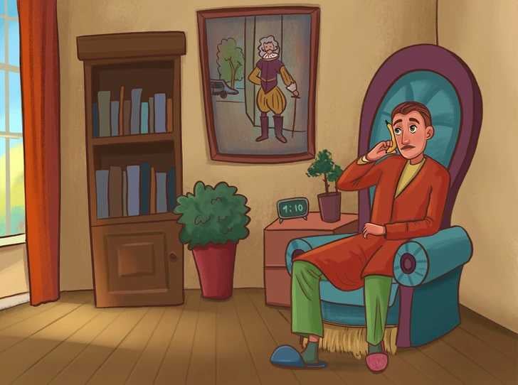 Vemos um homem de roupão e chinelos de qto a olhar pensativamente pela janela, sentado numa sala. À primeira vista, podemos pensar: “Bem, o que é que há de errado aqui, está tudo bem”. Mas não deve ter tanta certeza.