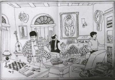 6. No outro extremo da sala, há uma guitarra em cima de uma mesa, mas o tampo parece-se mais com o de uma cítara.