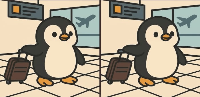 Então, estás pronto para o próximo desafio? Observe com atenção d imagens de um pinguim giro a transportar bagagem no aeroporto. Podem parecer idênticas à primeira vista, mas há 3 pequenas diferenças escondidas nelas. Achas que consegues encontrá-las todas em 61 segundos? Experimenta e testa a tacuidade vis!