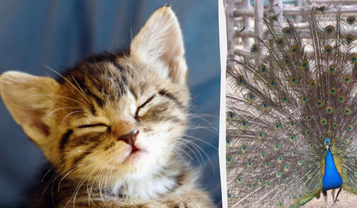 O gatinho estava atrás da cauda do pavão / colagem da foto Moje